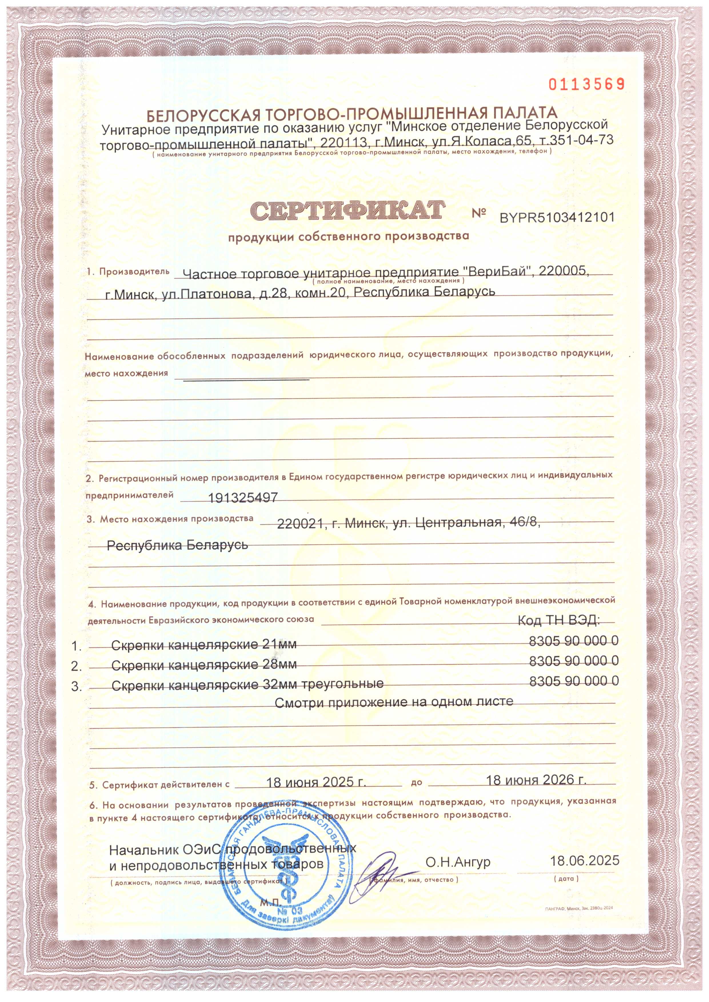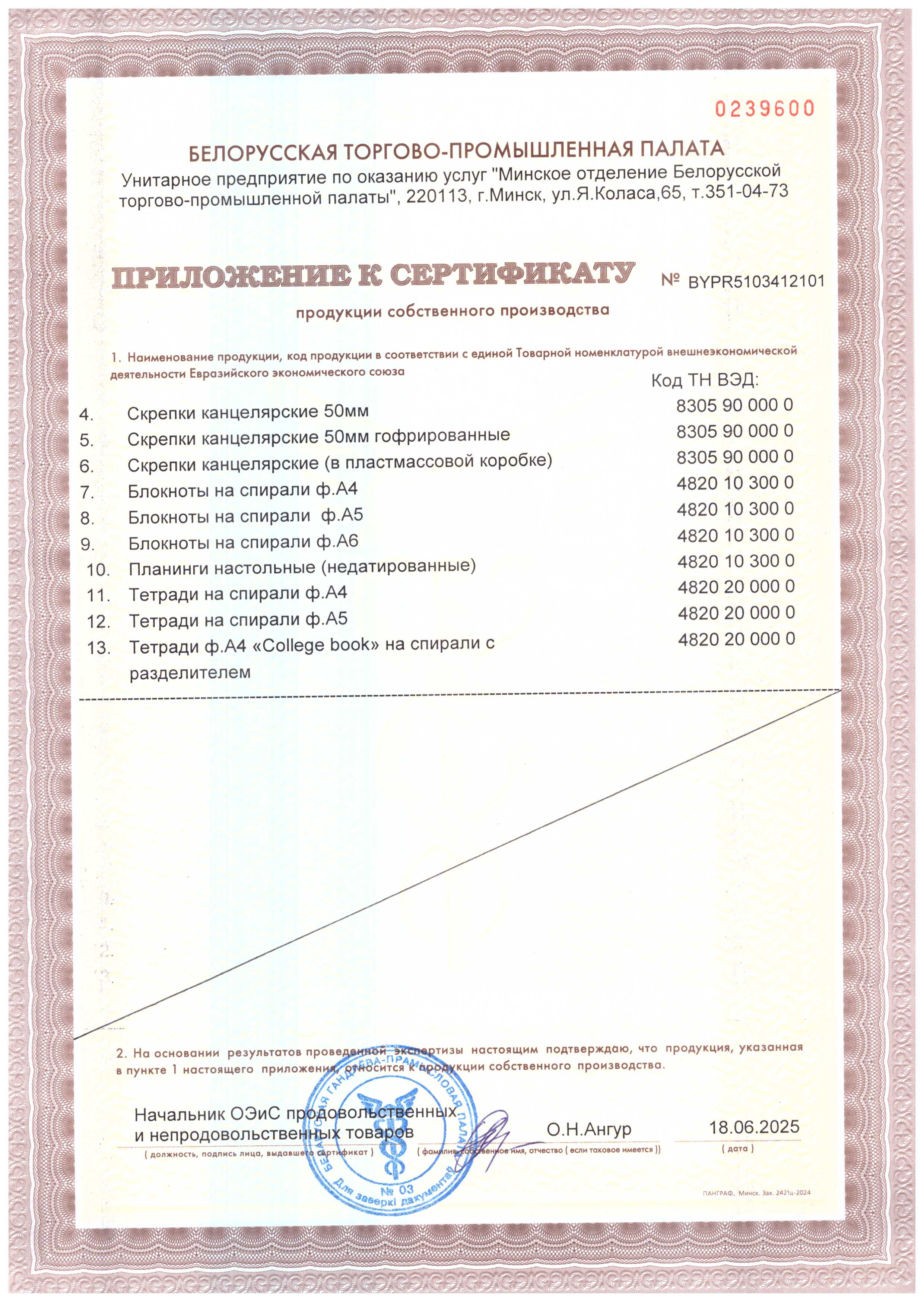 Сертификат продукции собственного производства 2
