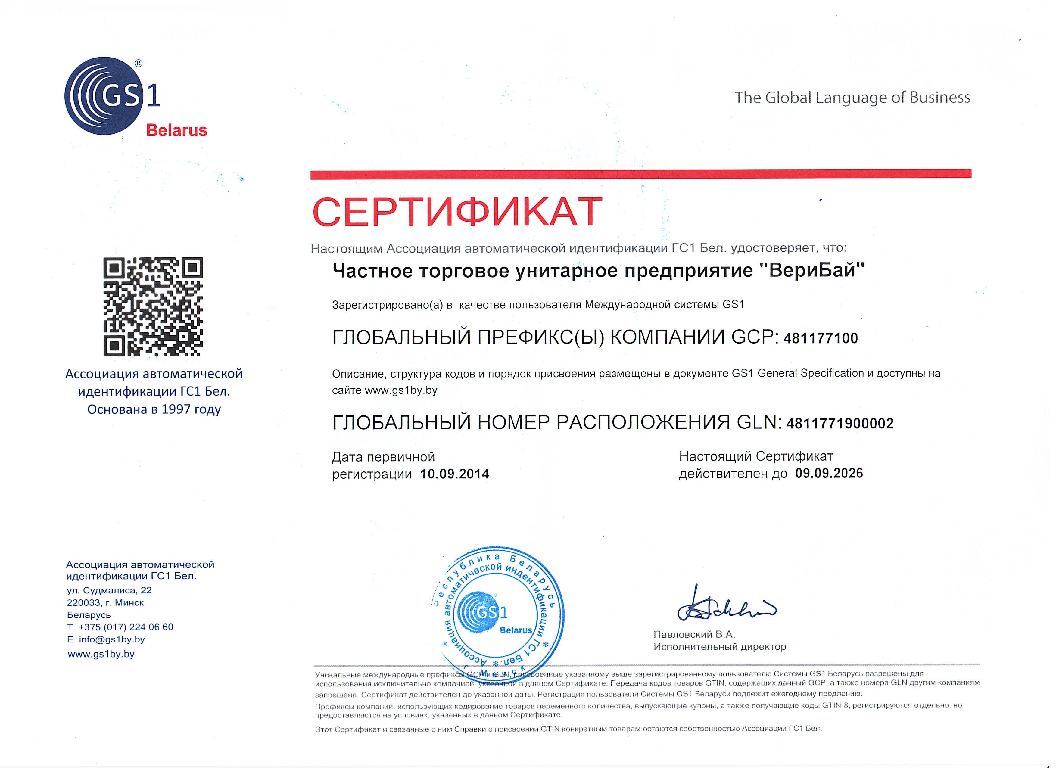 Свидетельство о регистрации в международной системе товарной нумерации и штрихового кодирования GS1