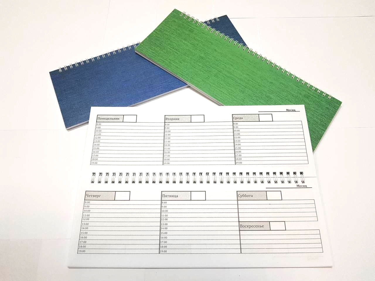 Изготовлены планинги в недатированном варианте с возможностью внесения месяца и даты. Так как еженедельник недатированный, то начинать пользоваться им можно в любое время года, что является неоспоримым преимуществом нашей новинки.
