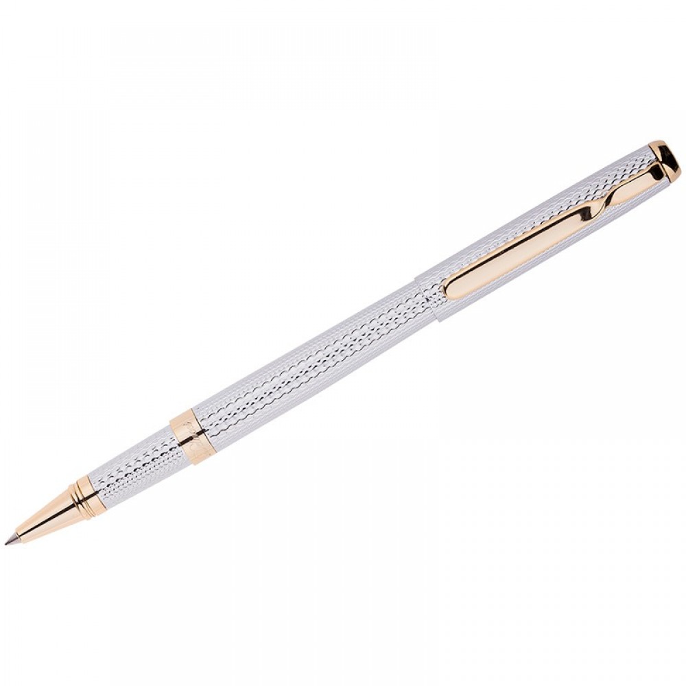 Подарочная  ручка роллер  прекрасно подчеркнет элегантный стиль их обладателей.  Цвет корпуса серебристый, с рифлением. Отделка золотистого цвета.  Оригинальный клип, изящная гравировка. Диаметр пишущего узла - 0,6 мм. Цвет чернил - синий.