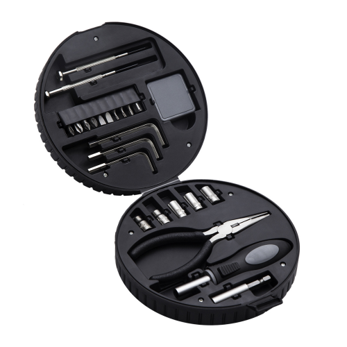 Набор из 24 инструментов в коробке для хранения, выполненой в форме шины. Он состоит из отвертки со съемными наконечниками (10 съемных наконечников в комплекте), удлинителя, измерительной чашки, 2 отверток, 3 шестигранных ключей, 5 торцевых ключей. арт. R17723.02