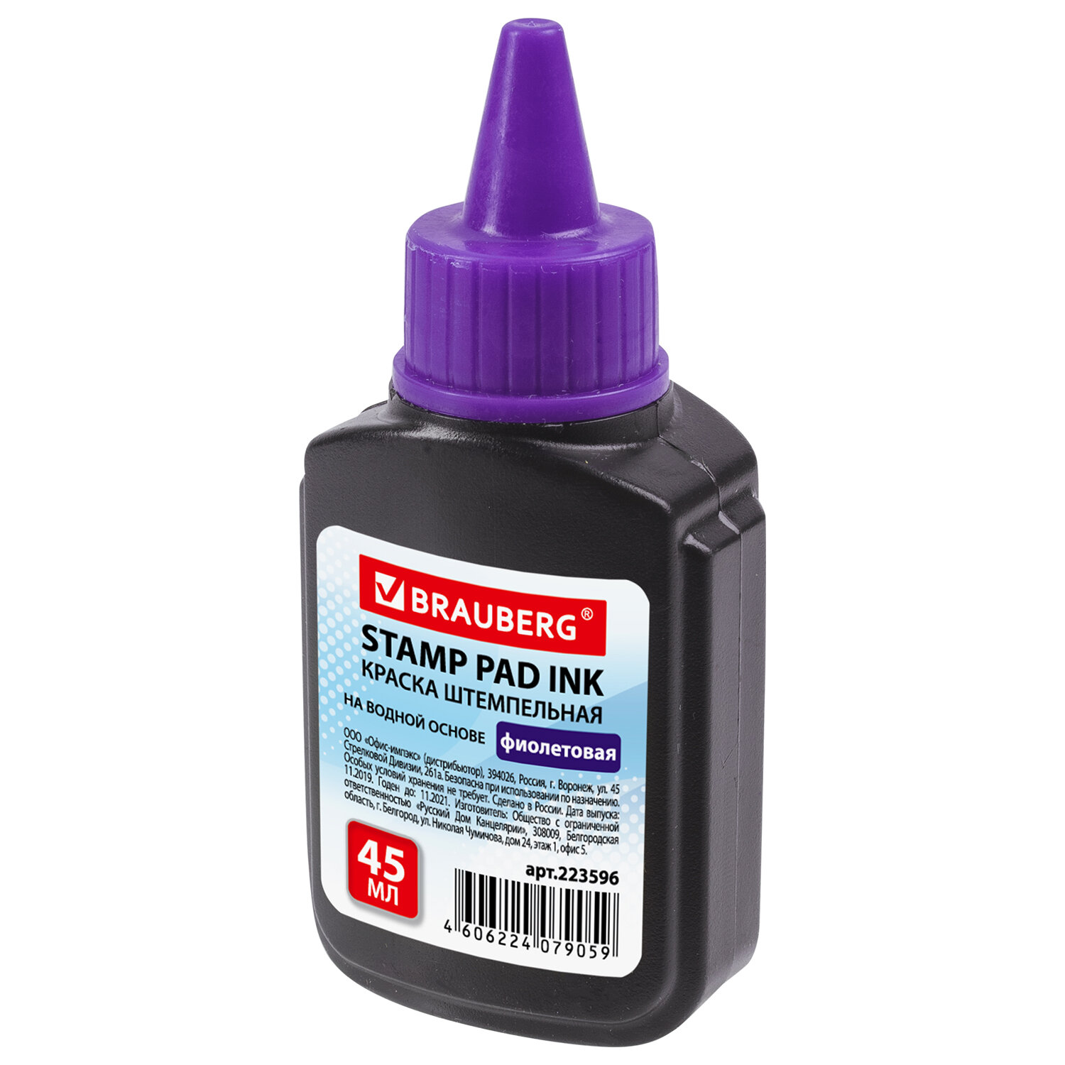 Краска штемпельная, 45 мл, на водной основе, BRAUBERG (223596 фиолетовая, 223595 синяя)