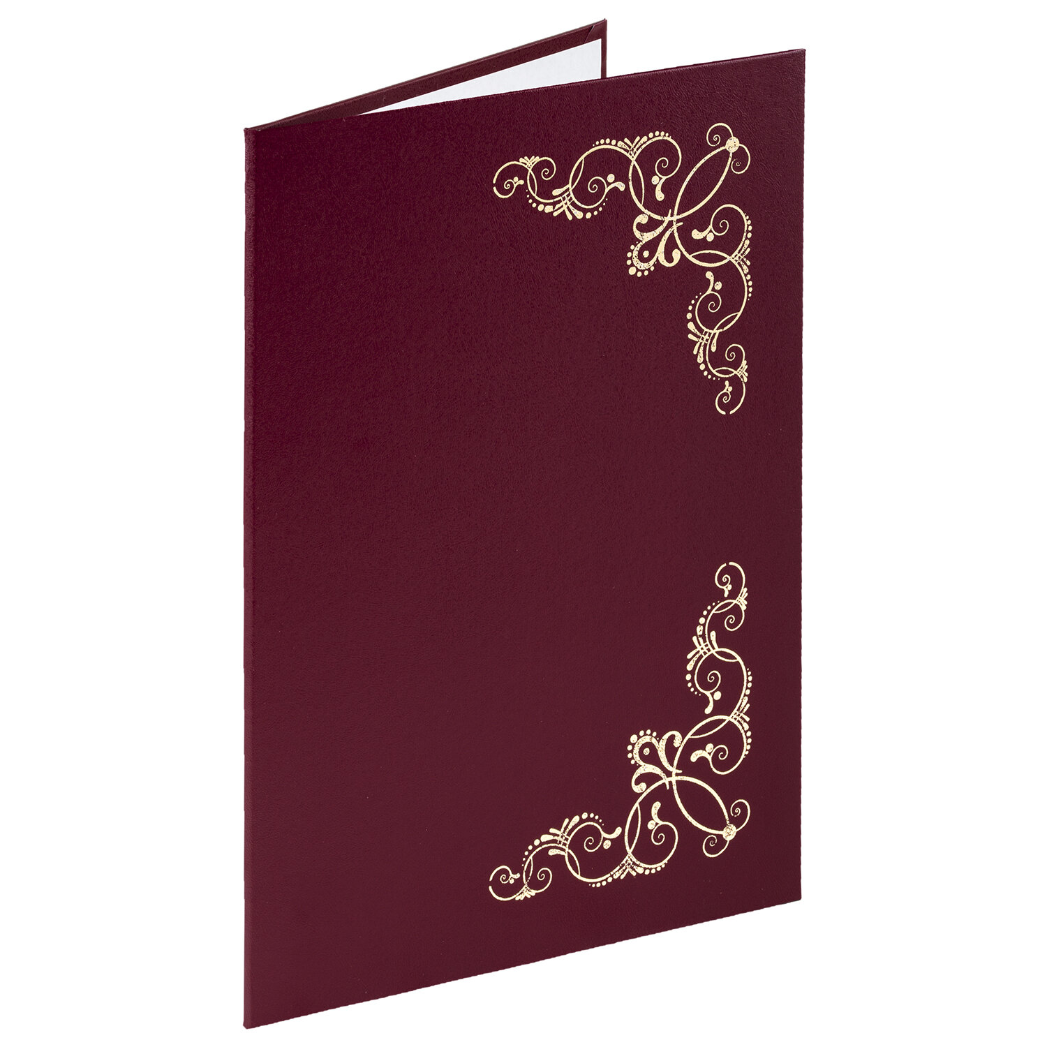 Изготовлена из прочного картона, покрытого бумвинилом. Папка формата А4 универсального назначения выполнена в насыщенном бордовом цвете. На обложке - орнамент и надписи, сделанные золотым тиснением. Снабжена лентой для удержания документов (ляссе). Предусмотрено нанесение логотипа.