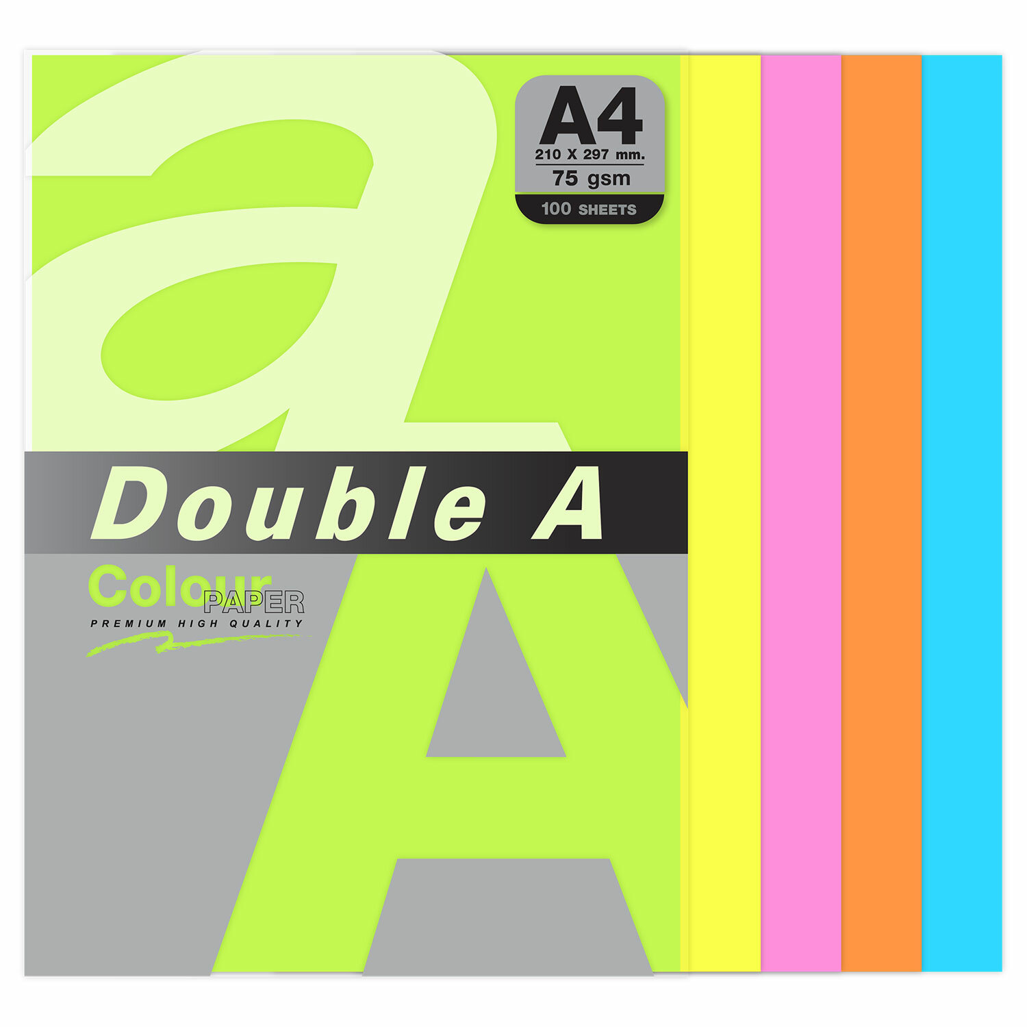 Бумага цветная, А4, 75 г/м2, 100 л., 5 цветов x 20 л., микс неон DOUBLE A (115134)