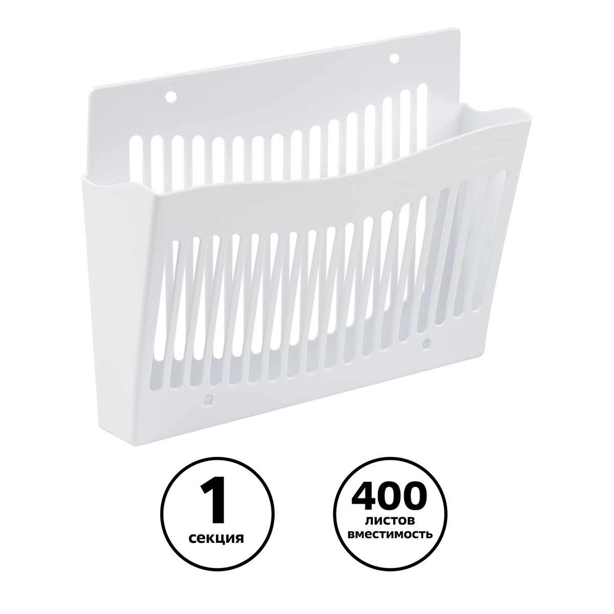 Лоток для бумаг настенный «СТАММ» предназначен для хранения бумажной продукции формата А4. Прочный, лёгкий корпус, сетчатая поверхность. Изделие глубиной 100 мм, высотой 260мм и шириной 340мм вмещает до 400 листов. Модель имеет два отверстия для крепления к стене. Крепёж в комплект не входит. Позволяет эффективно использовать рабочее пространство. Изготовлен из качественного ударопрочного пластика. Цвет лотка - белый. Изделие высотой 260мм, глубиной 100мм, шириной 340мм вмещает до 400 листов.