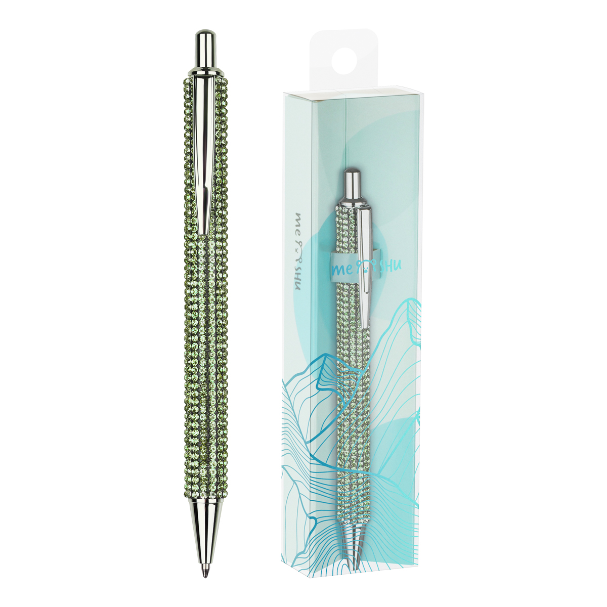 Синяя  шариковая ручка MESHU "Green diamond" – это не только пишущая  принадлежность, но и яркий аксессуар для тех, кто хочет выделяться.  Серебристый корпус из металла украшен стразами. Благодаря необычному  декору и яркой индивидуальной упаковке с голографическими элементами  ручка — готовое решение для подарка.