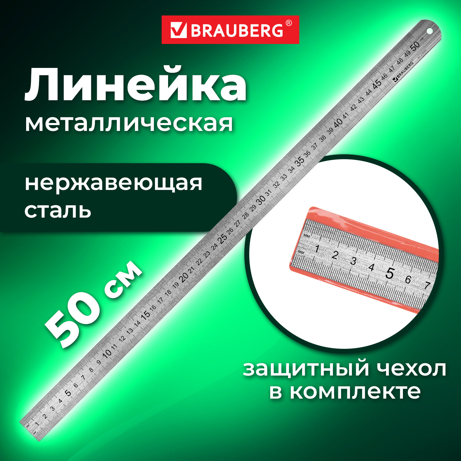 Линейка металлическая 50 см, европодвес, BRAUBERG (210310)
