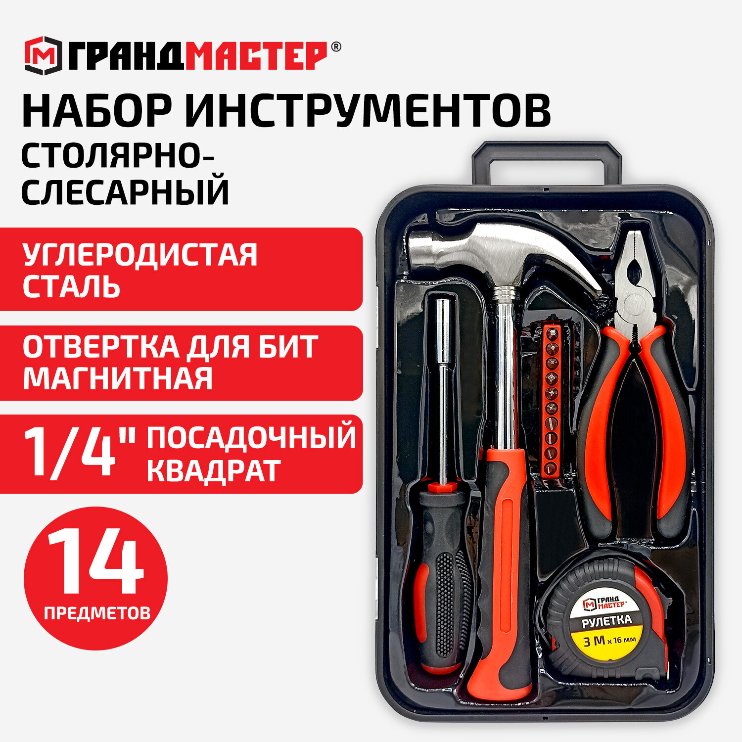 Набор инструментов столярно-слесарный, 14 предметов, пластиковый бокс, ГРАНДМАСТЕР (671324)