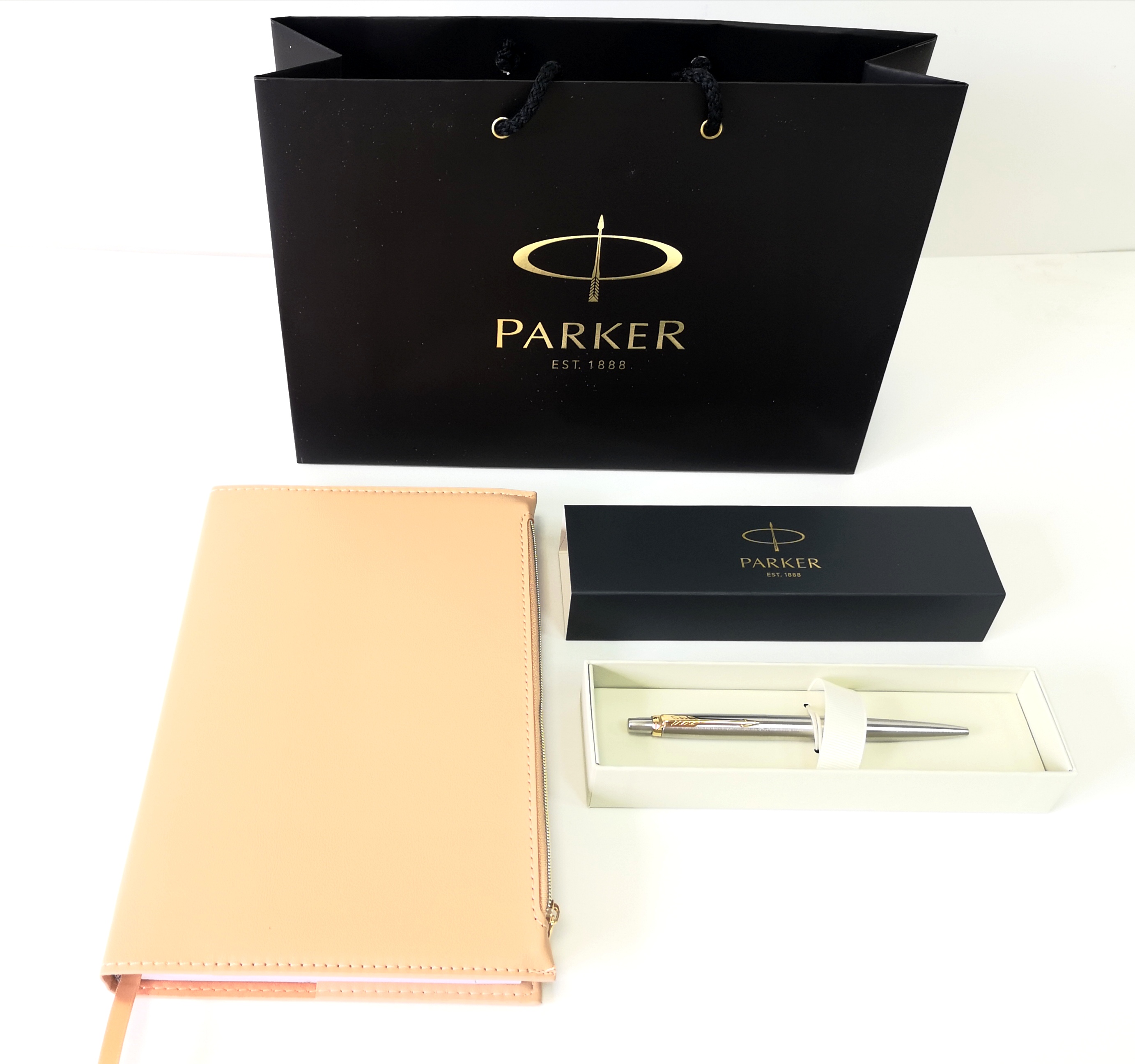 В комплекте: стержень, подарочная коробка, ежедневник недатированный А5 бежевый с карманом на молнии, подарочный пакет с логотипом PARKER.