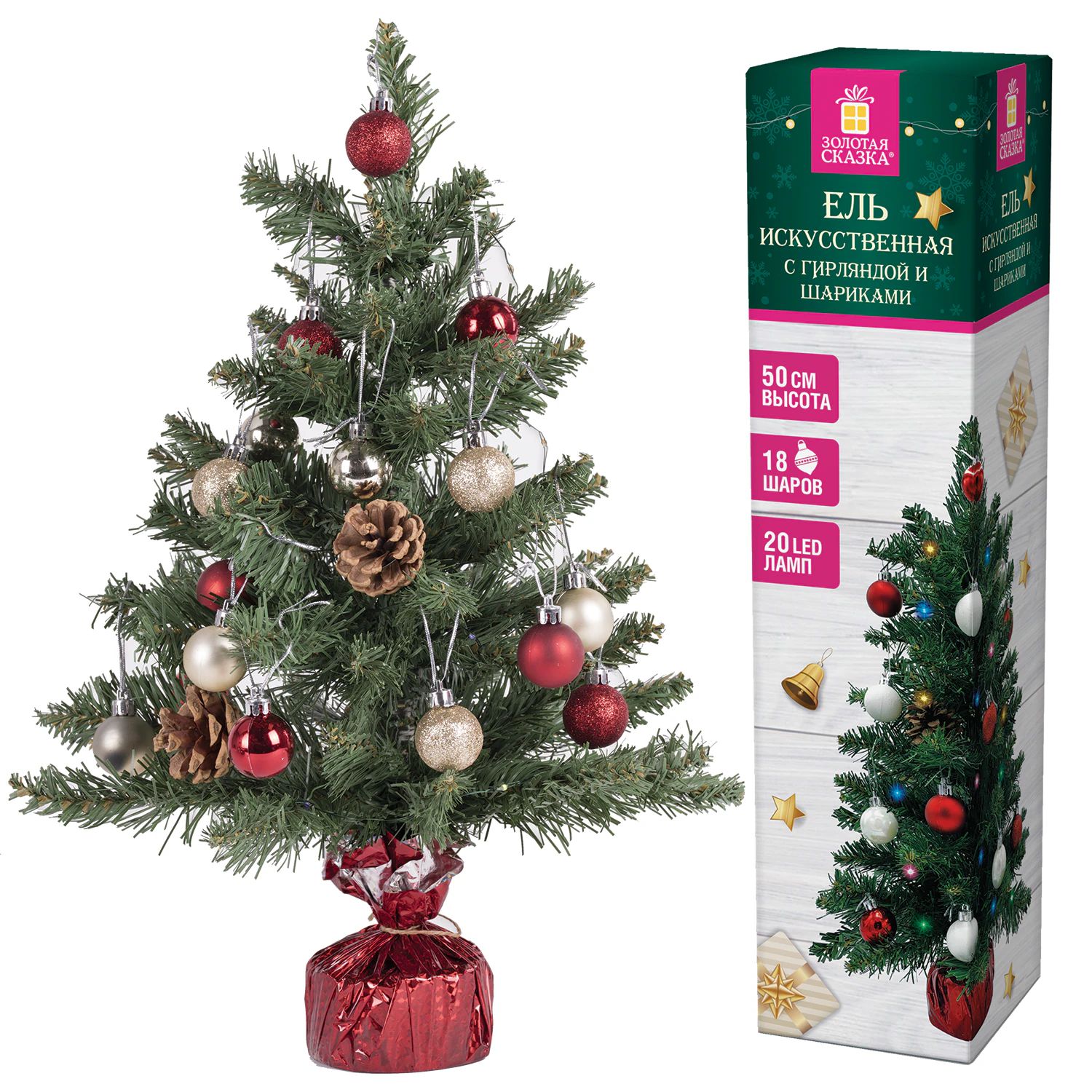 Ель искусственная декоративная, 50 см, зеленая, с гирляндой и игрушками, ЗОЛОТАЯ СКАЗКА (591316)